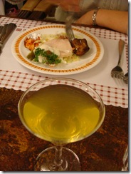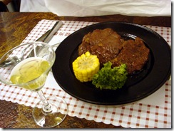 ↑以上均為B餐內容,包括餐前雞尾酒、沙拉、開胃菜,另外還有香蒜麵包和奶油餐包。媽媽說雞尾酒的氣泡口感,像是果汁加維大力XD;沙拉則是非常妙,除了生菜之外,盤中還有滷雞肉搭配沙拉醬,哈哈,真是創意料理啊~頂妙的說~ 鮑魚濃湯口味還不錯,裝在鐵盒裡盛了上桌,是我喜歡的台式玉米濃湯,也可以撈到鮑魚料(應該是那種罐頭代鮑吧)。B餐的重頭戲當屬主菜牛排,牛排有醃過,已經吃不出原本的鮮美肉汁了,不過煎得很香,七分熟肉質吃起來恰恰好。套餐的份量是夠的,只是價錢就得看各人的接受程度了~
