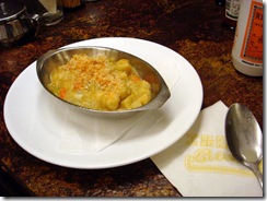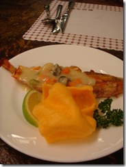 這道菜反而令人最為失望,不過它的配料很特別,請抛棄那種把起司鋪在整條大明蝦上頭鋪大量起司焗烤的印象,它的作法是將明蝦切塊之後,扮入奶油醬,跟筍子、白菜、洋蔥,最後再烤過,我妹失望的說,蝦子乾乾的,量很少,一點也不好吃...不過用筍子入菜這實在太有趣,台式西餐果然就是要有當地食材一起混搭啊~